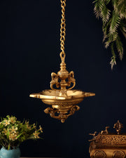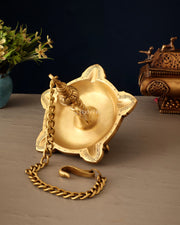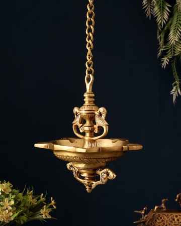 Illuminate your sacred space with this intricately crafted Brass Hanging Diya featuring a graceful parrot design. Symbolizing beauty and devotion, this traditional lamp adds charm to any pooja room or festive decor.