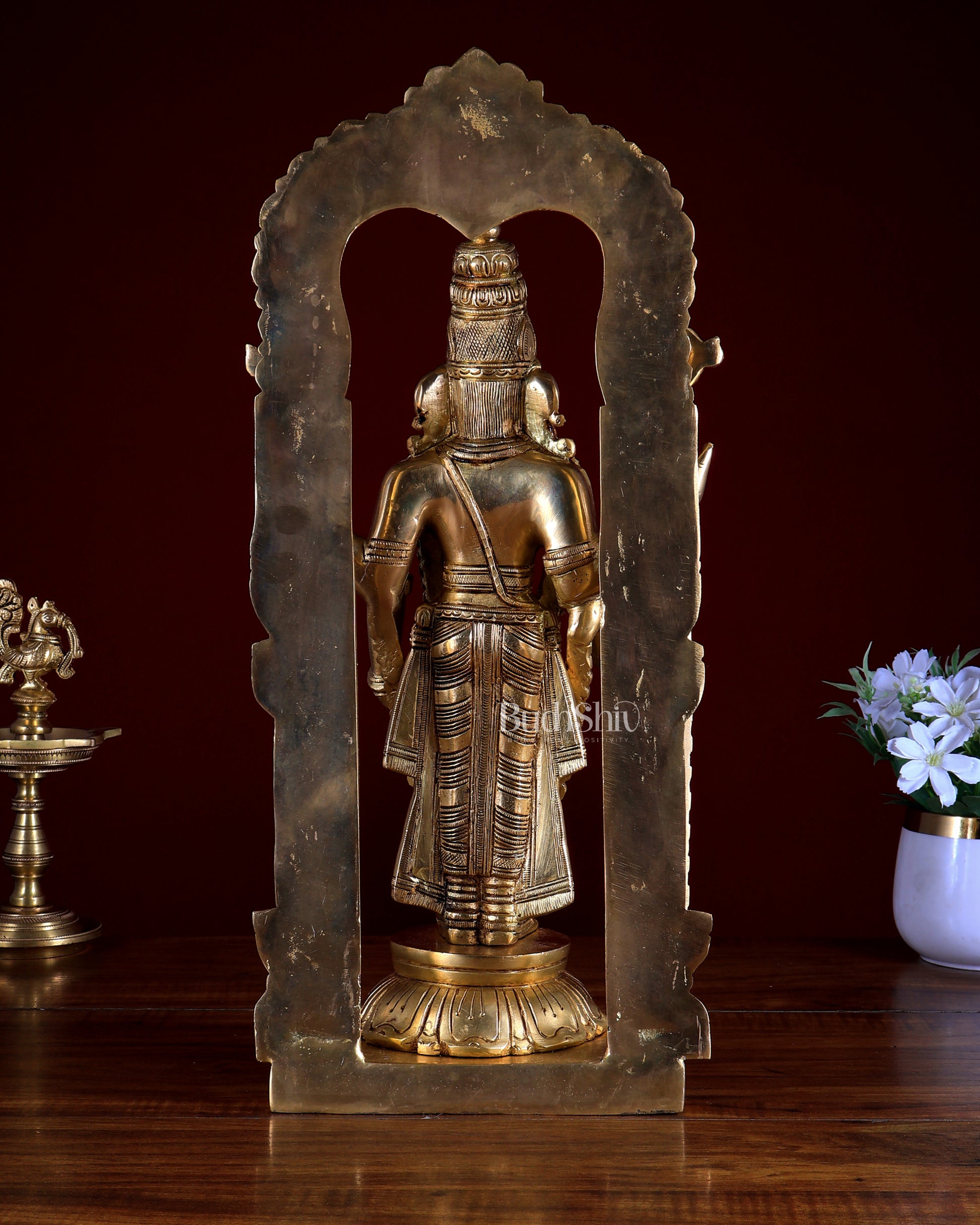 Discover the divine beauty of our 17-inch superfine brass Tirupati Balaji Lord Venkateshwara statue, elegantly framed and adorned with a hanging mala. Handcrafted with precision, this masterpiece stands at 17 inches in height, 8 inches in width, and 7 inches in depth, with a weight of 8.5 kg. Bring home the blessings of Lord Venkateshwara and enhance your spiritual space with this captivating artwork. Shop now and cherish the divine presence