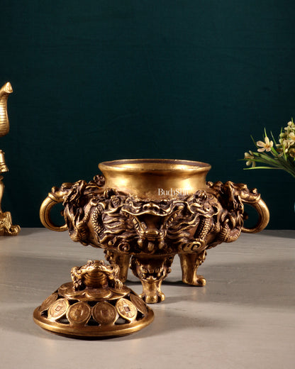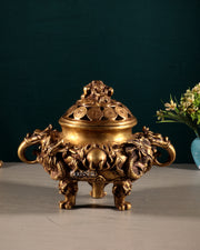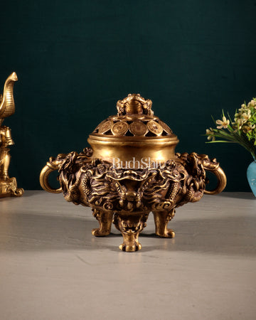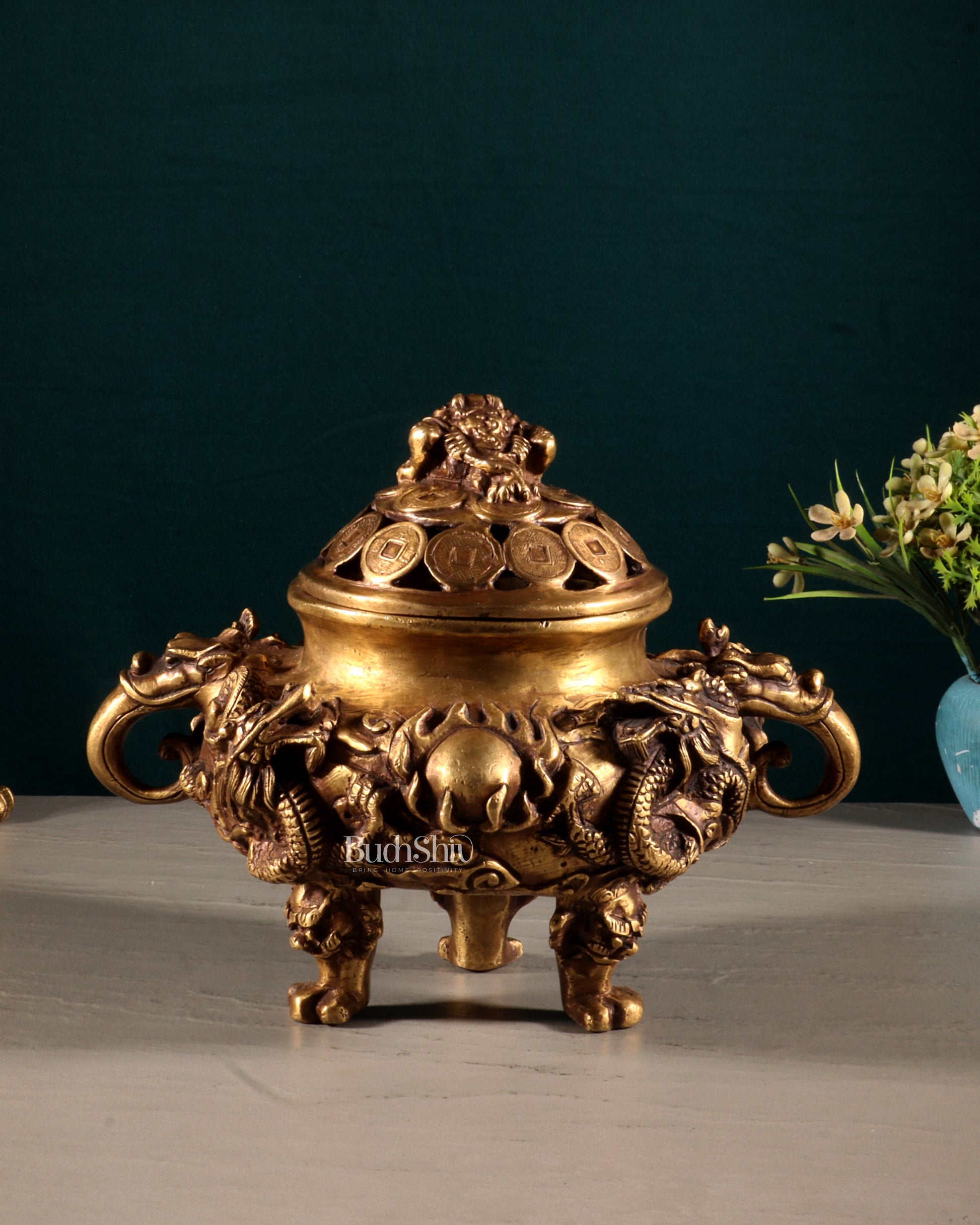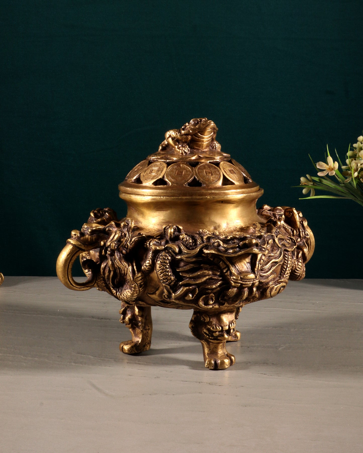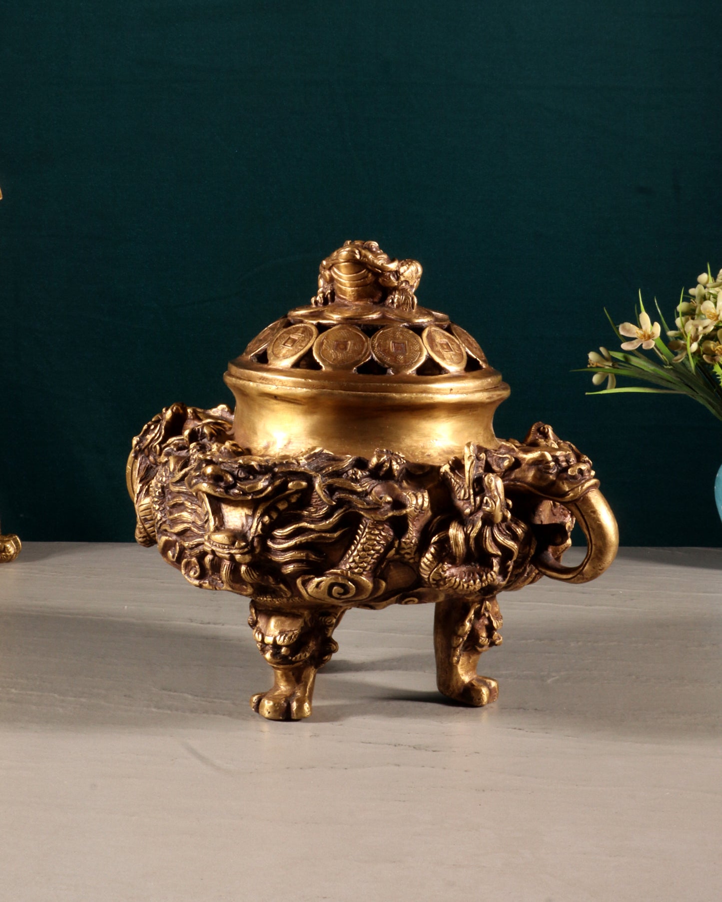 Pure Brass Vintage Dhoop Burner with Buddhist Dragon Carvings 6"
