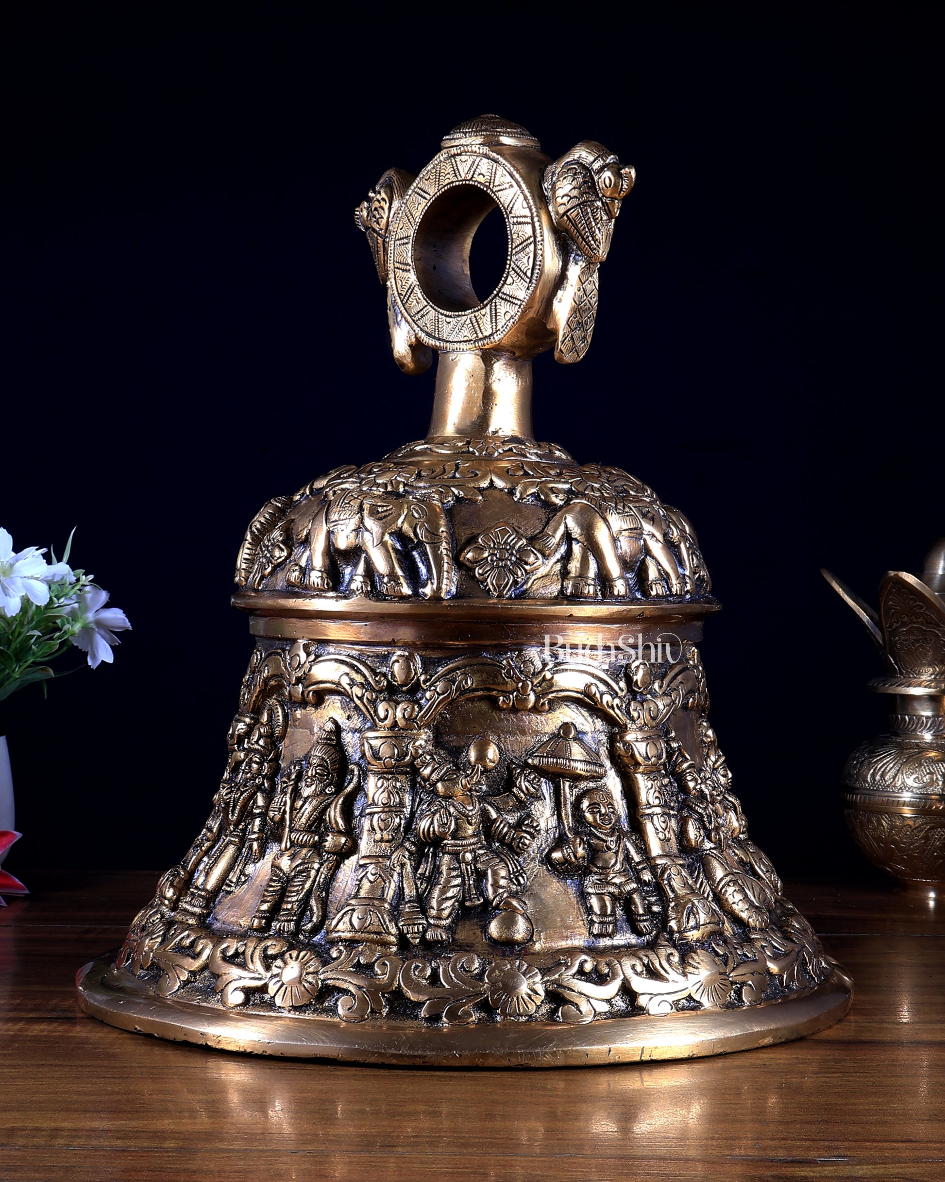 Pure Brass Vishnu Dashavatar hanging temple bell, with shankh chakra namah motifs. Surrounded by marching elephants design, fully hand-engraved and heavy mandir ghanta. Bell size 13.5 x 11.5 x 11.5 inches, weight 14.5 kg, total length with chain 41 inches. Ideal for temples and mandirs.