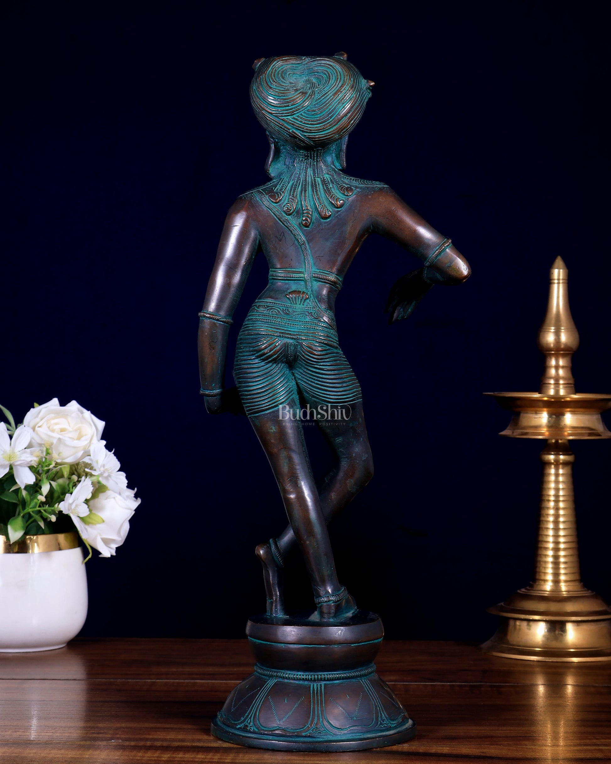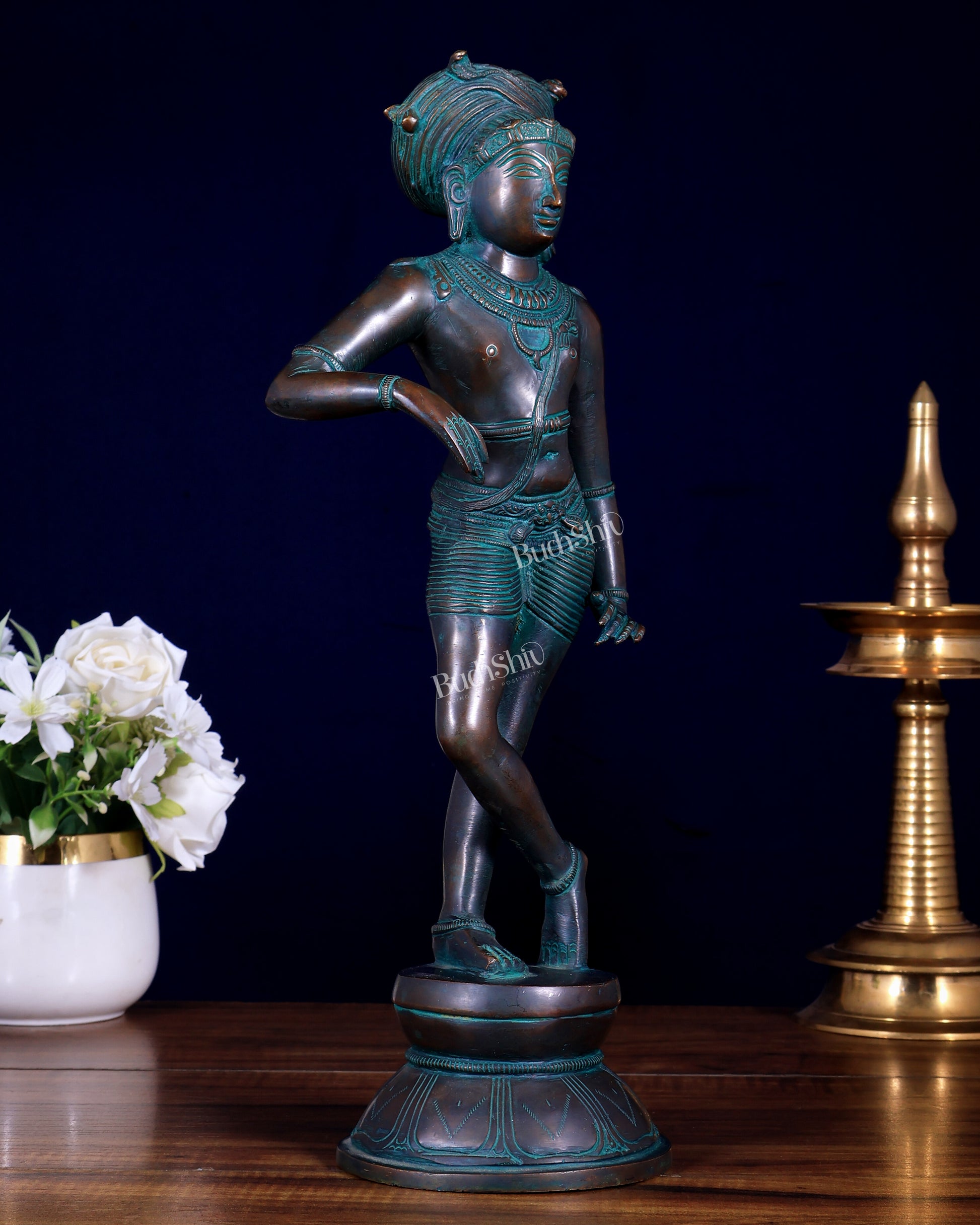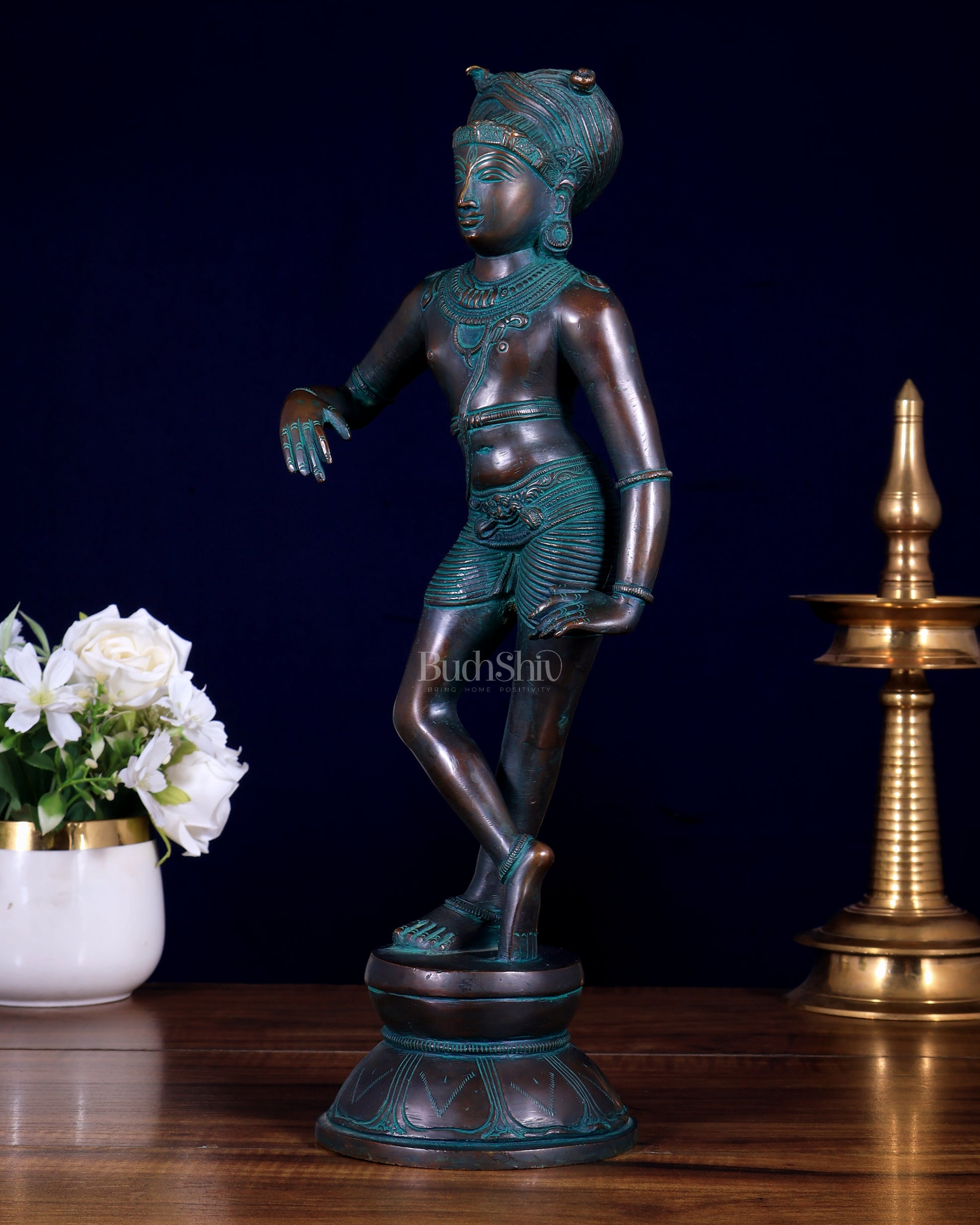 Chola-style brass Vrishabdeva/ Vrishavavahan standing Shiva statue with Shirastraka turban in antique bronze tone Measures 15 x 6 x 5 inches, weighs 3.98 kg. Historic design with intricate detailing.