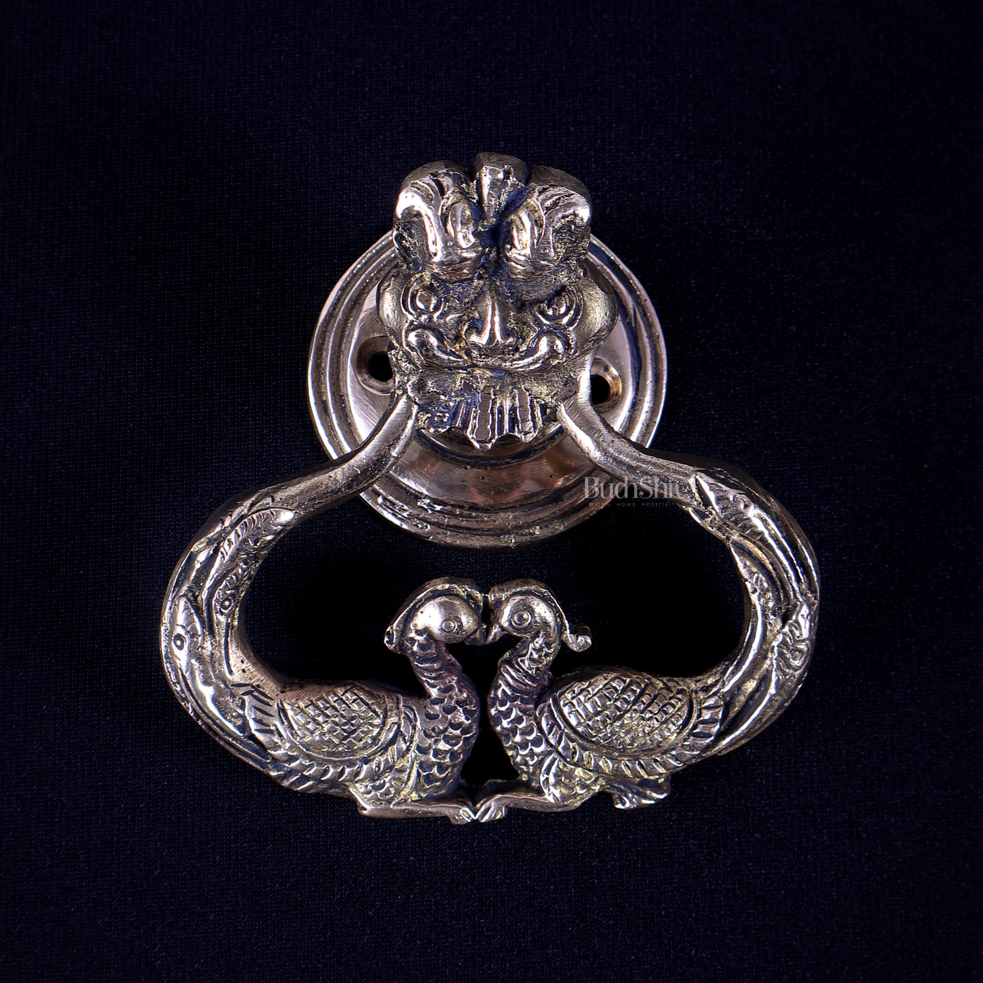 The symmetrical dual peacock design enhances balance and auspicious energy, while the expressive Yali face signifies vigilance and protection at the threshold. Handcrafted from solid brass, this door knocker brings together mythology, vastu significance, and timeless artistry—making it ideal for main doors, pooja room entrances, heritage homes, and luxury villas.