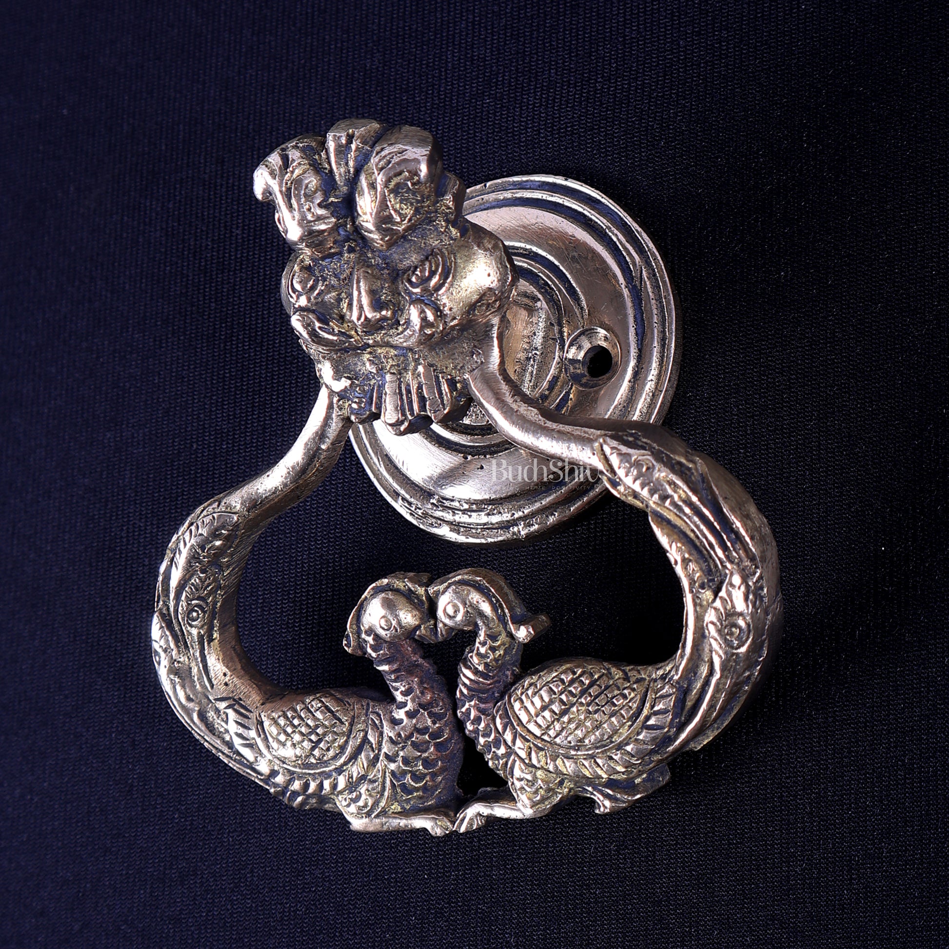 This Pure Brass Yali Design Face Door Knocker with Dual Peacock is inspired by classical South Indian temple motifs, where the Yali serves as a powerful guardian and the peacock represents beauty, abundance, and spiritual awakening.
