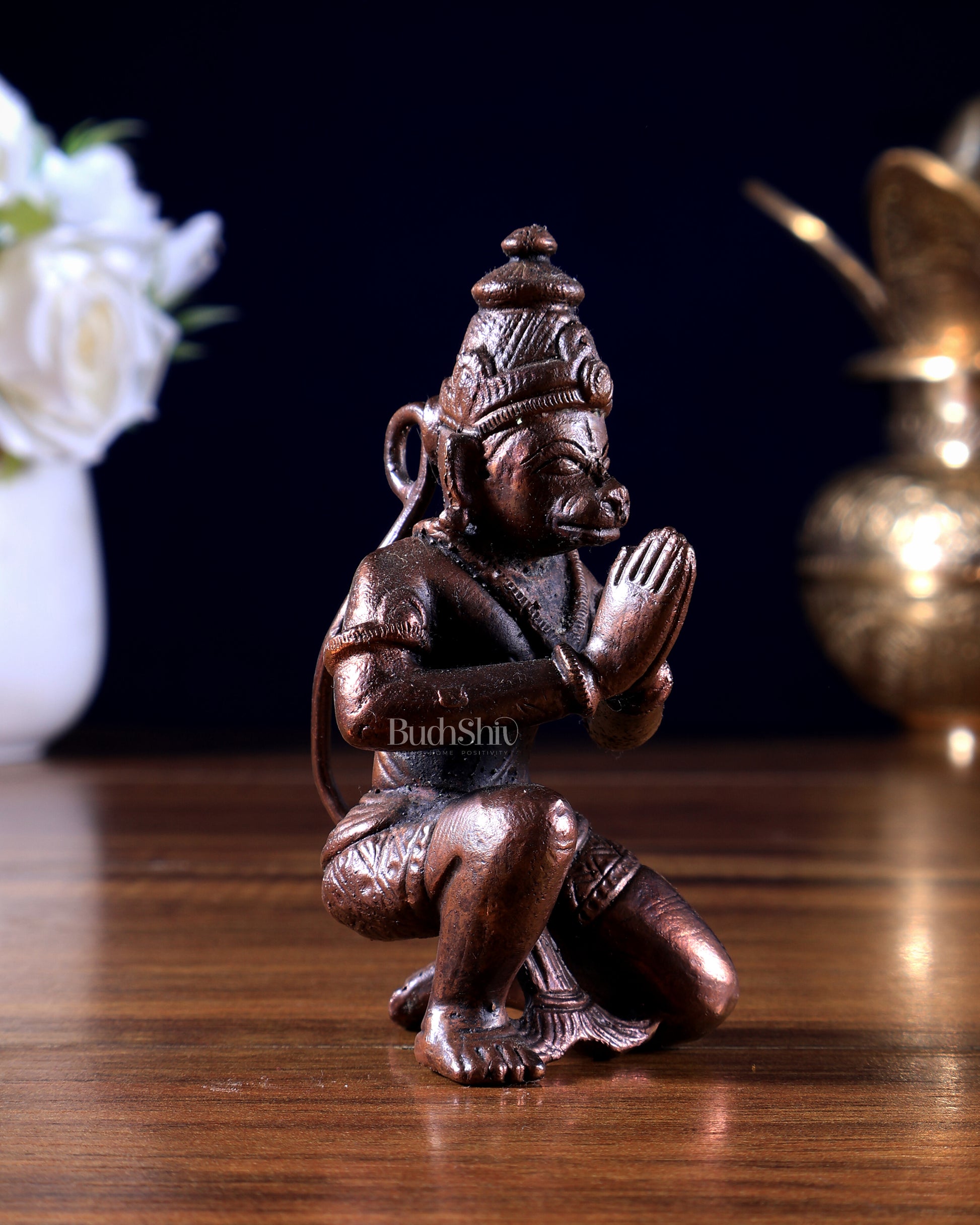 Bring home the divine blessings of Lord Hanuman with this beautifully crafted pure copper idol, depicting Hanuman ji in a kneeling anjali namaskar mudra. This compact yet powerful sculpture is perfect for your home temple, office desk, car dashboard, or as a meaningful gift.