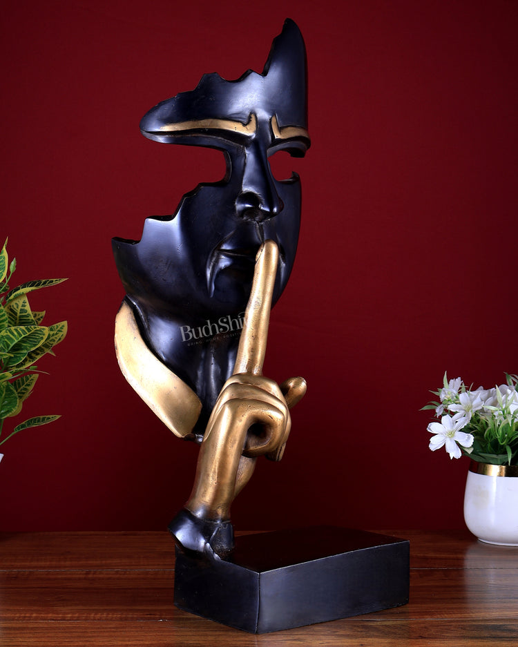 Make a bold artistic statement with this Silent Man Brass Decorative Artefact, featuring the iconic gesture of one finger placed on the lips, symbolizing silence, mystery, mindfulness, and contemplation. With a dramatic theatrical presence, this superfine brass showpiece blends contemporary symbolism with traditional metal craftsmanship.