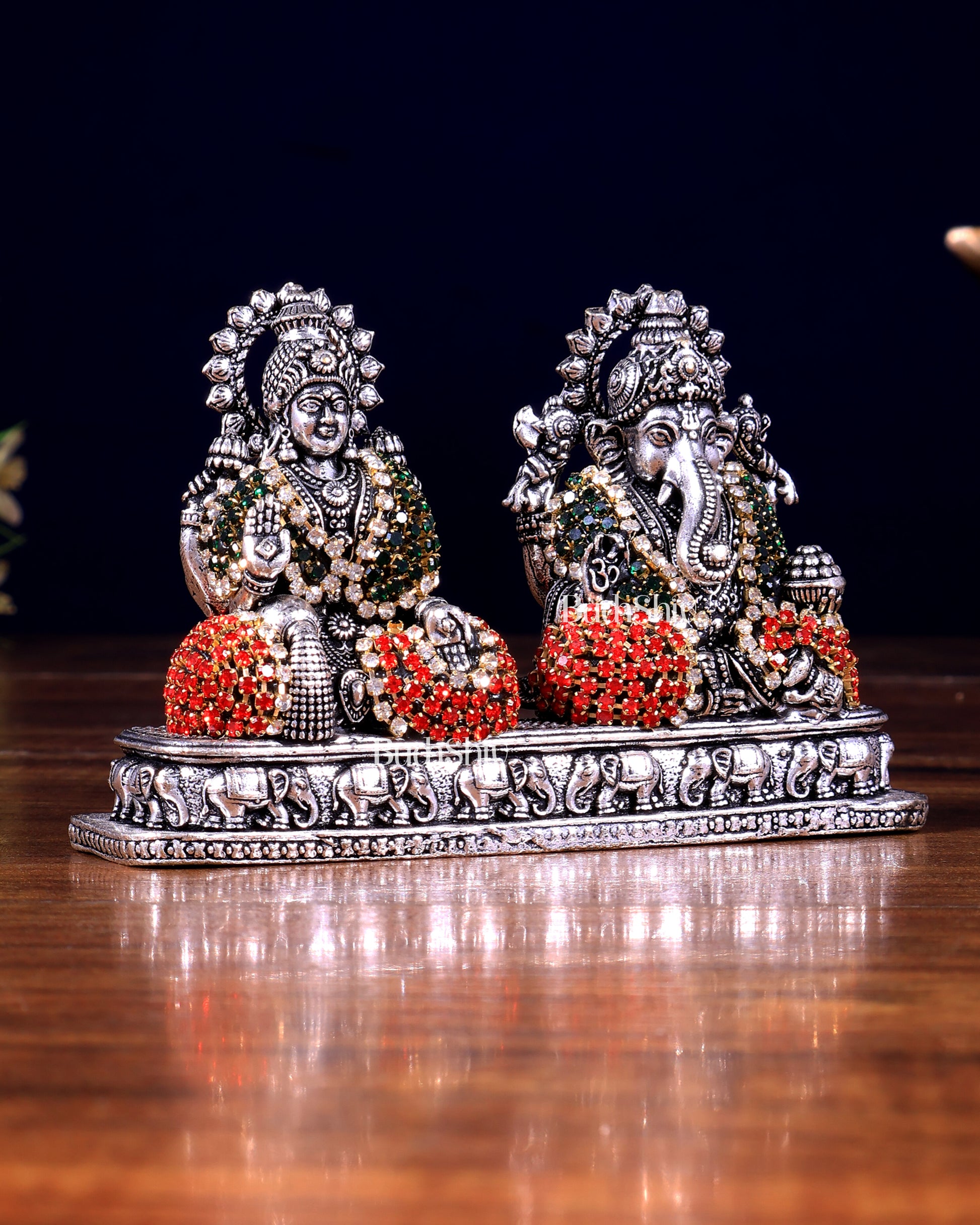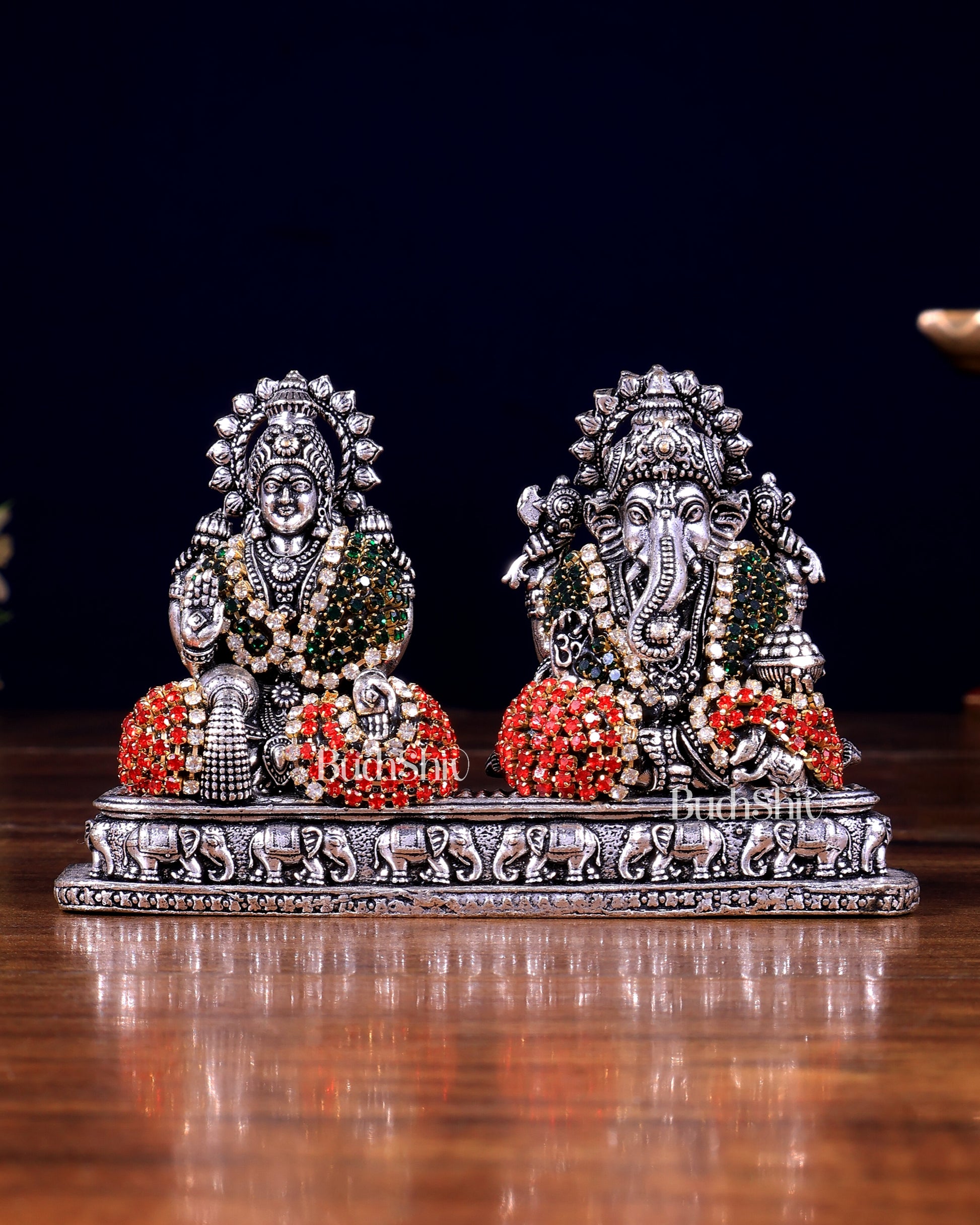 This intricate superfine silver plated brass idol of Ganesh and Lakshmi on same base with jewellers meenakari. Measuring 3 inches in height, 3.75 inches in width, and 1.5 inches in depth, and weighing 250 grams, this beautifully crafted piece is ideal for small altars or gifting to loved ones for blessings.