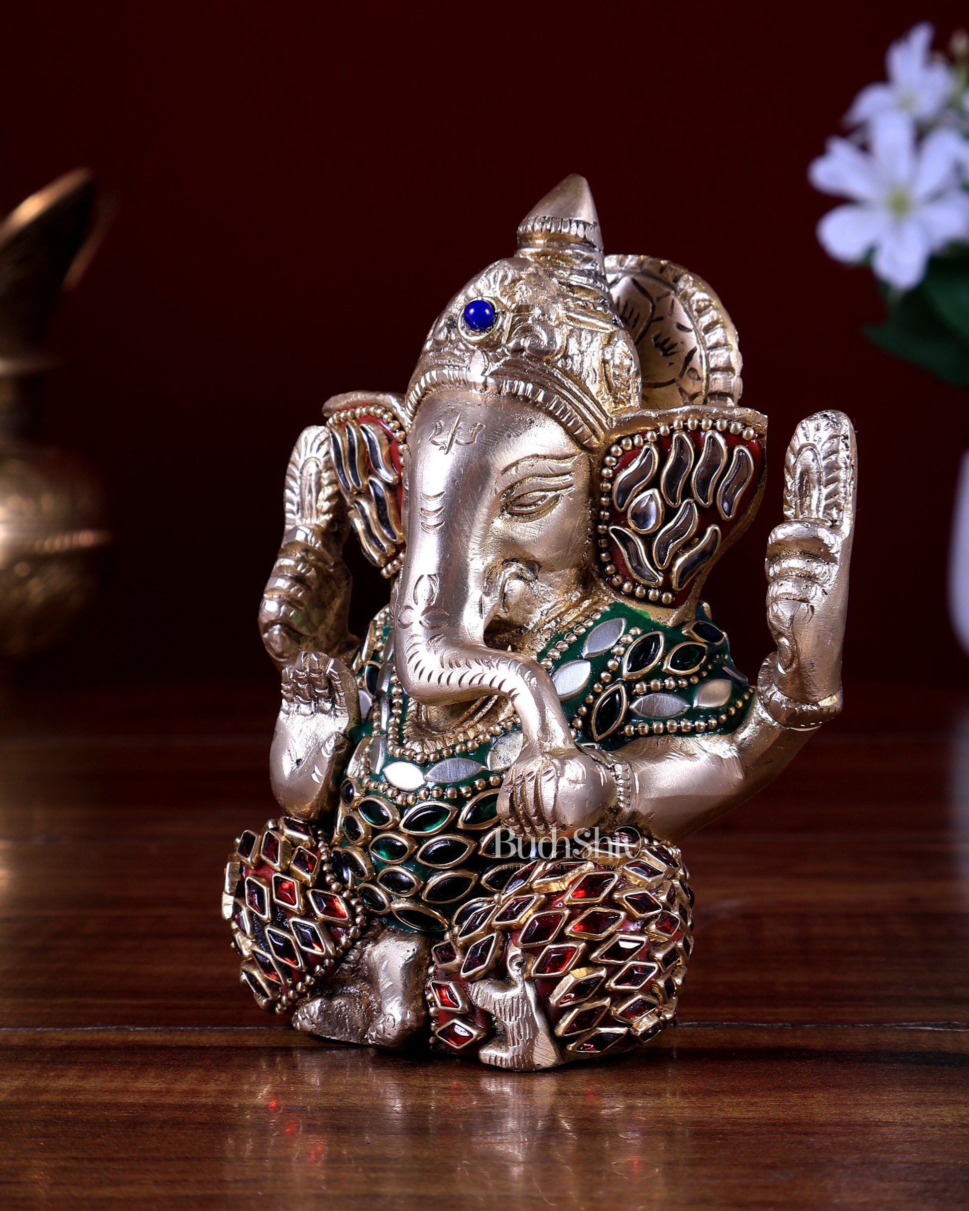 Embrace blessings with our small Pure Brass Lord Ganesha Idol, intricately adorned with stonework. Standing at 5 inches in height, 4 inches in width, and 2.5 inches in depth, this divine creation, weighing 0.8 kg.