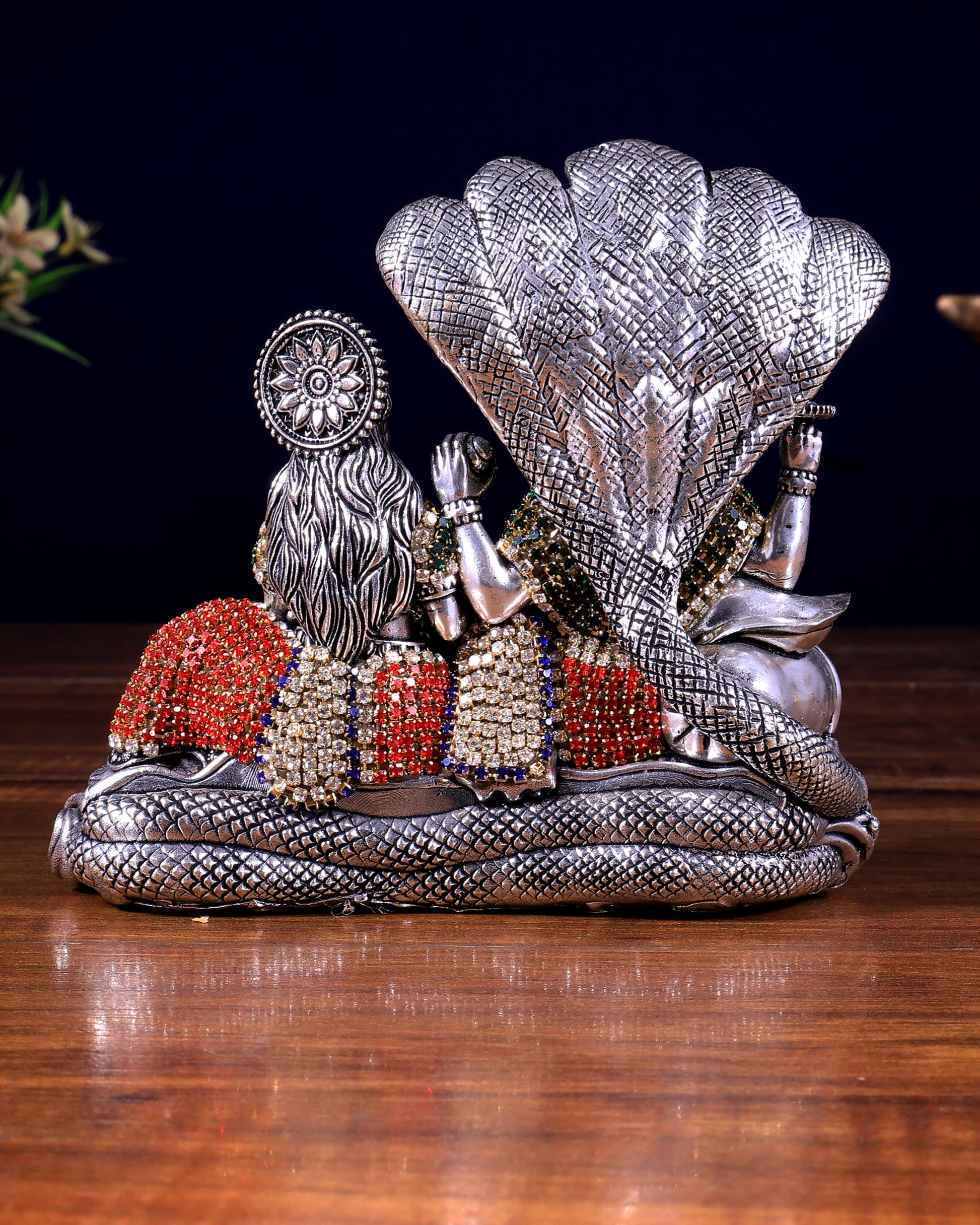 Elevate your space with our superfine brass idol of Lakshmi Narayana Vishnu silver plated with Jewellers artwork, adorned with Adisheshanaag. Bring divine energy to your home with the intricate craftsmanship and spiritual significance of this finely detailed idol. Choose size.