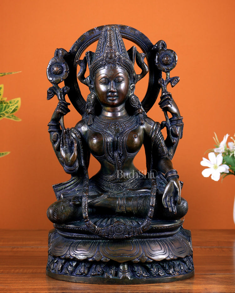 This Unique Brass Goddess Lakshmi Statue is inspired by the classical Chola style, renowned for its graceful proportions, fluid posture, and refined iconographic detailing. Maa Lakshmi, the divine embodiment of prosperity, abundance, and auspiciousness, is portrayed with elegance and serenity, reflecting the timeless artistry of South Indian temple traditions.