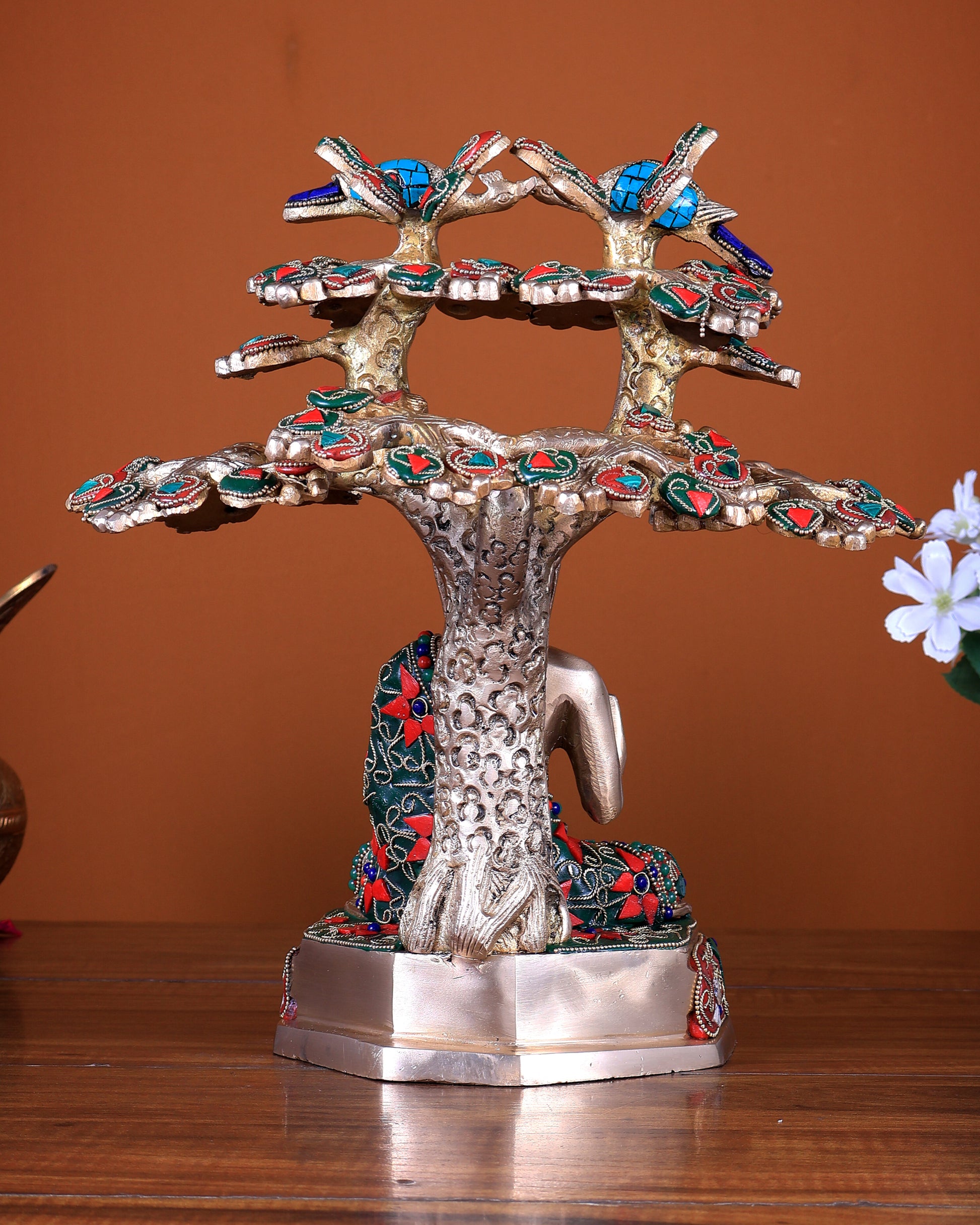 This Unique Pure Brass Buddha Under Bodhi Tree Statue beautifully represents Lord Buddha in meditation beneath the sacred Bodhi Tree, symbolising enlightenment, wisdom, peace, and awakening. The intricate stonework detailing enhances the visual depth and adds a refined artistic touch, making this sculpture truly distinctive.