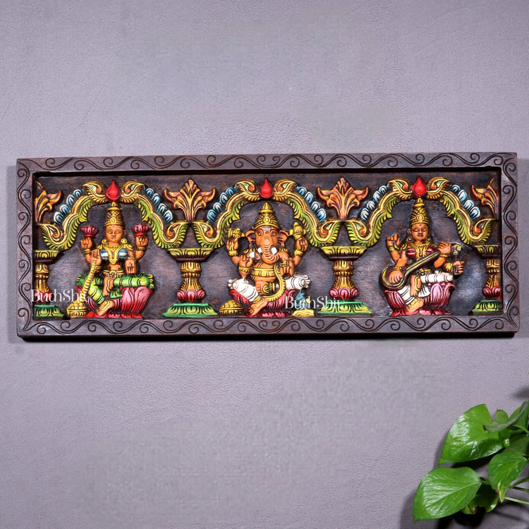 Hand-Painted Wooden Ganesha Lakshmi Saraswati Horizontal Wall Hanging – 24 Inch