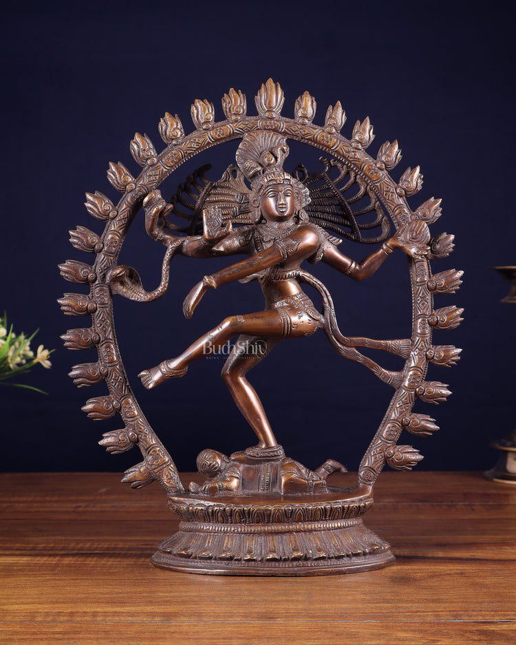 Pure Brass Nataraja with Oval Ring in vintage copper tone. Measuring 12 inches in height, 10 inches in width, and 3.5 inches in depth, and weighing 3.2 kg, this intricately crafted piece captures the divine dance of Lord Shiva, adding elegance and spiritual energy to any space. Perfect for enriching your home with cultural and artistic beauty.