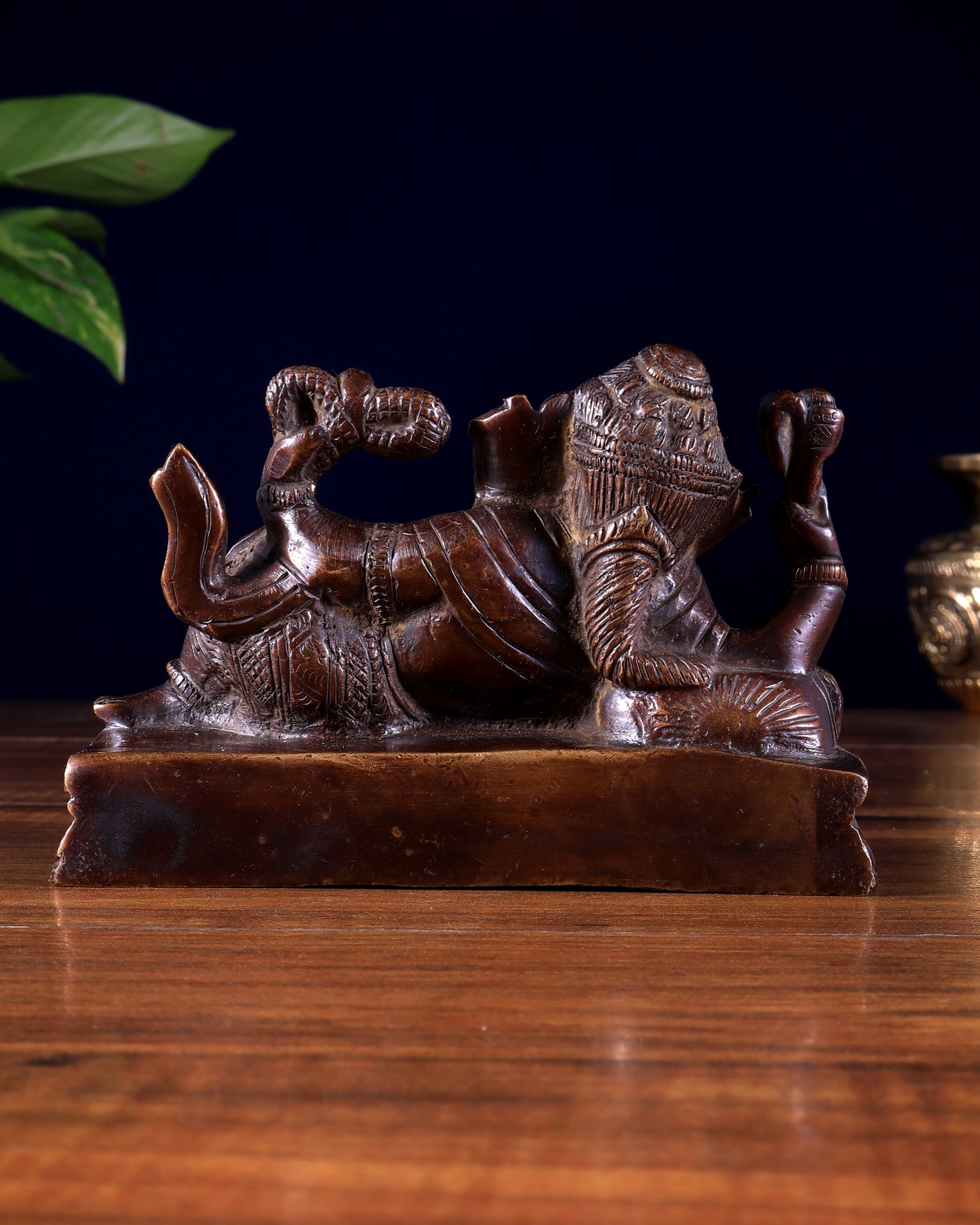 A charming Vintage Brass Resting Ganesha statue in a compact size, ideal for gifting and home décor. Lord Ganesha, the remover of obstacles and harbinger of wisdom, is beautifully depicted in a relaxed resting posture, radiating calmness and positivity.