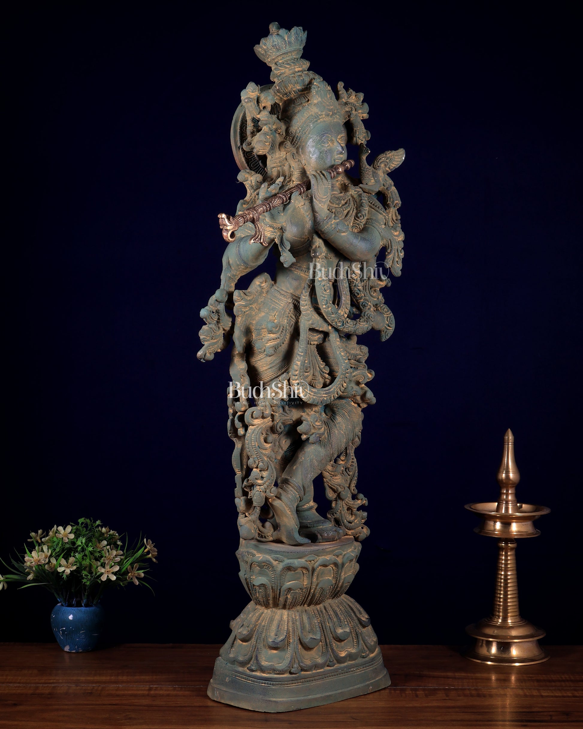 Vintage Krishna Brass Statue – Green Sand Patina Finish 30 inch